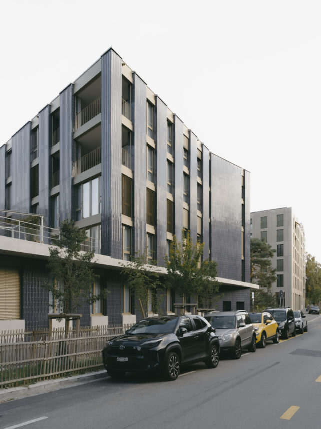 La petite marge de manœuvre existant dans le PLQ a permis d’attribuer à chacun des volumes une identité propre. Le 1er bâtiment (D) présente des retraits de façades qui mettent en évidence sa stratification programmatique en assurant une présence forte à la tête du quartier. Le second bâtiment (E) assume une plus grande banalité formelle en adéquation avec sa position dans le tissu bâti existant et à venir.