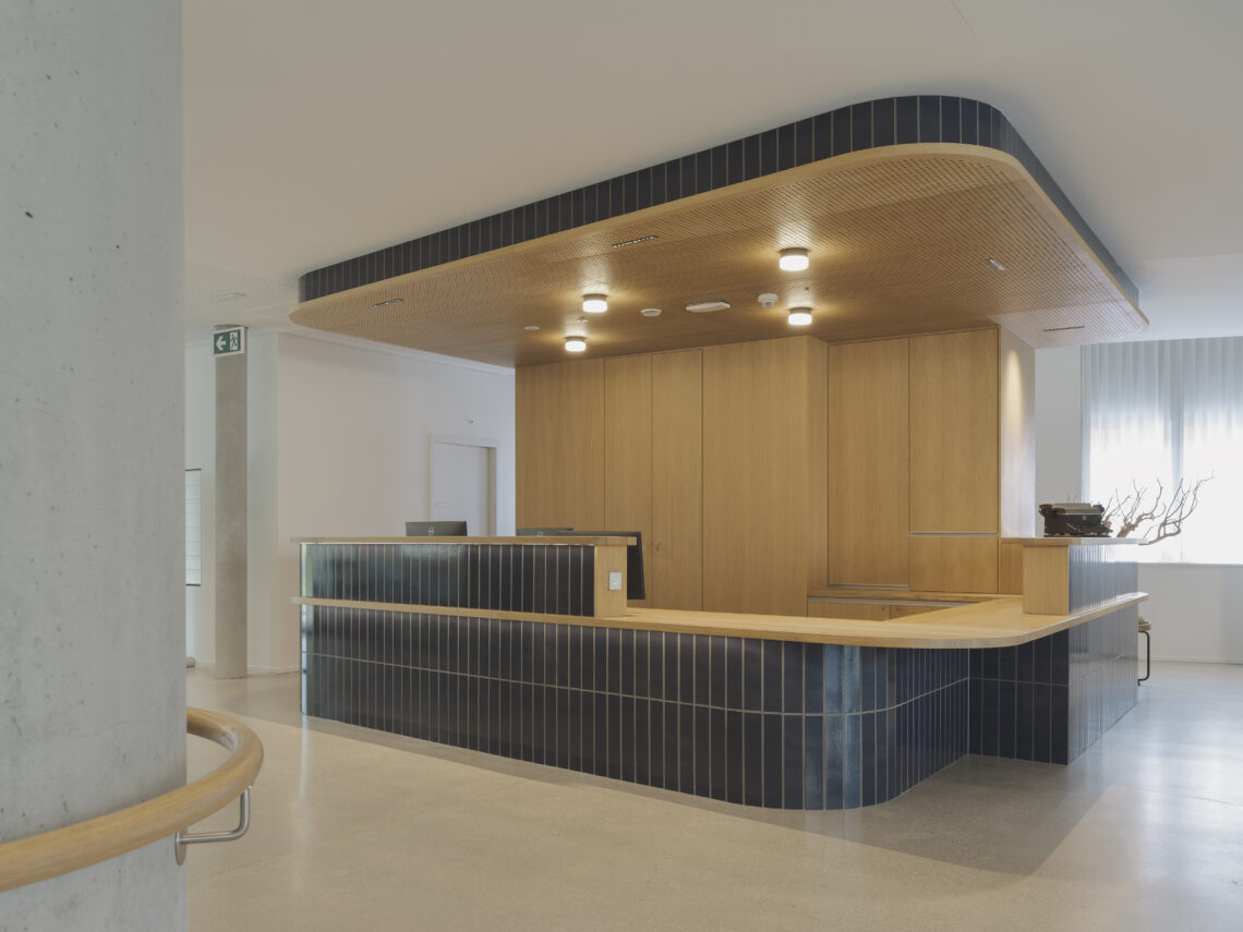 Disposition des locaux en anneau de part et d’autre de la pièce centrale. Structure porteuse préfabriquée en bois (poteaux et dalle de toiture), façades ventilées recouvertes de verre. Ventilation à double flux, matériaux pauvres en énergie grise et recyclables, label Minergie.